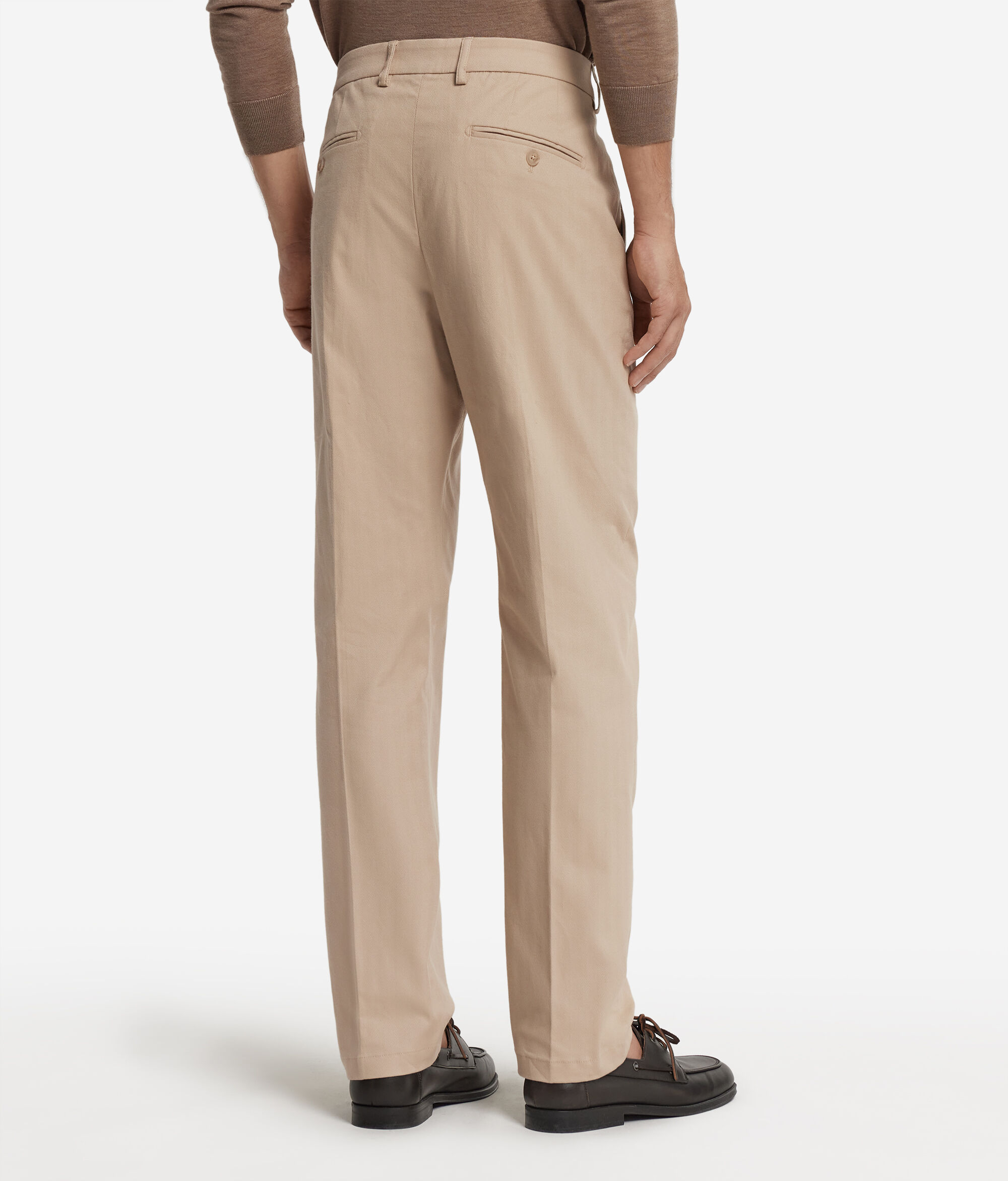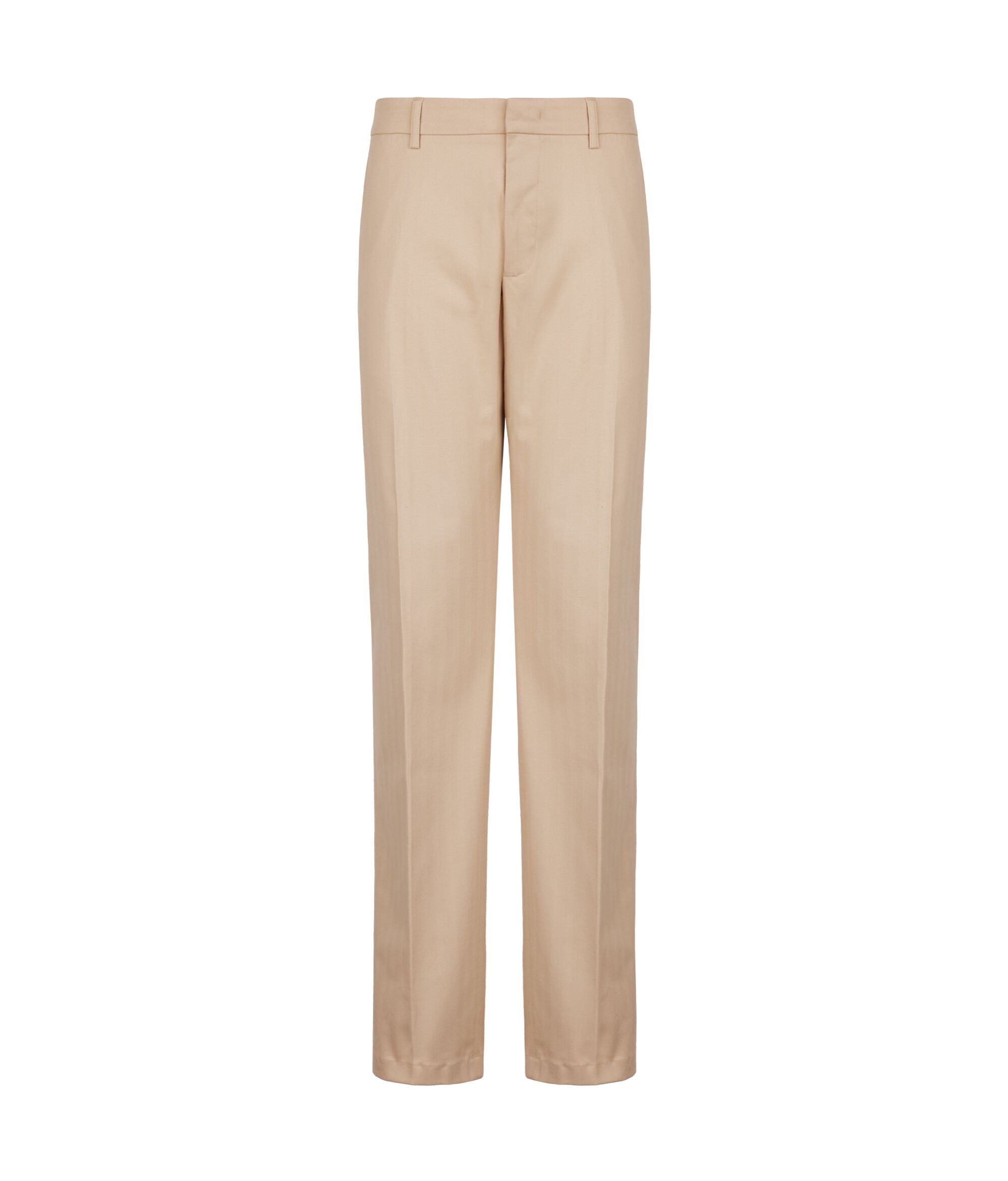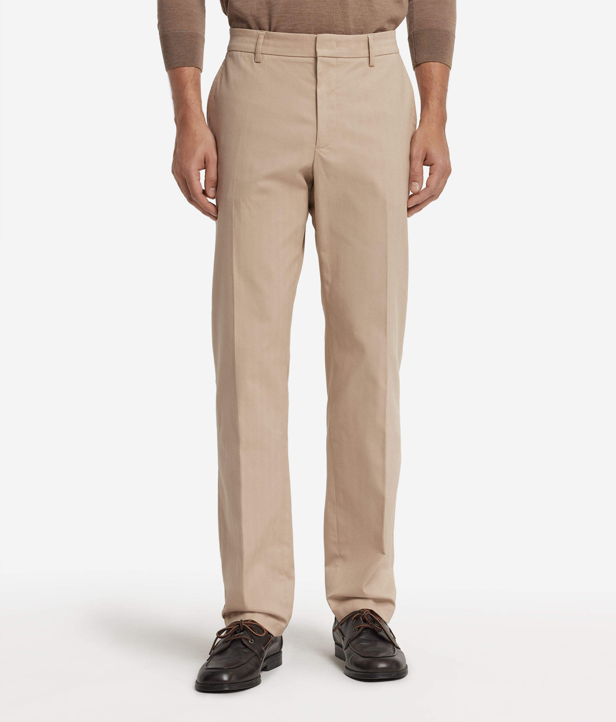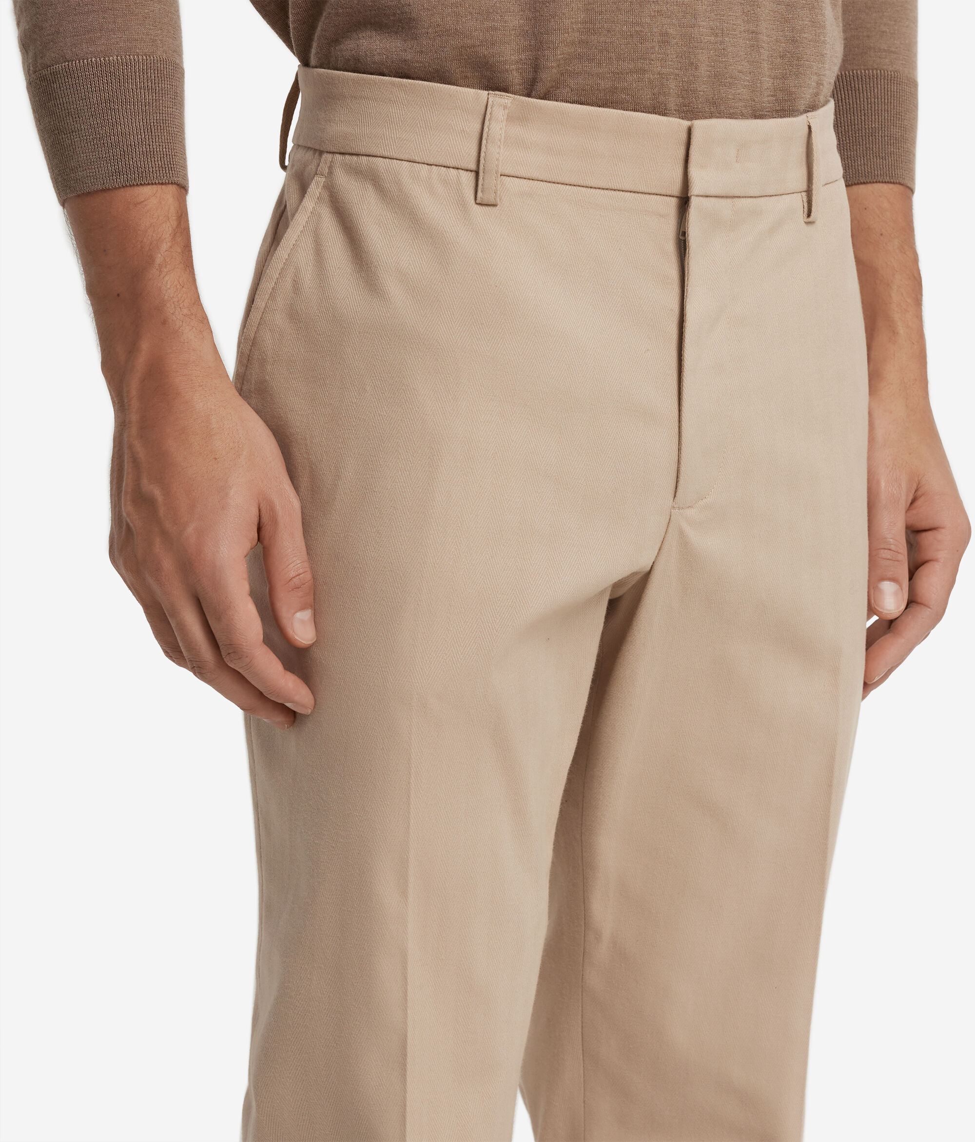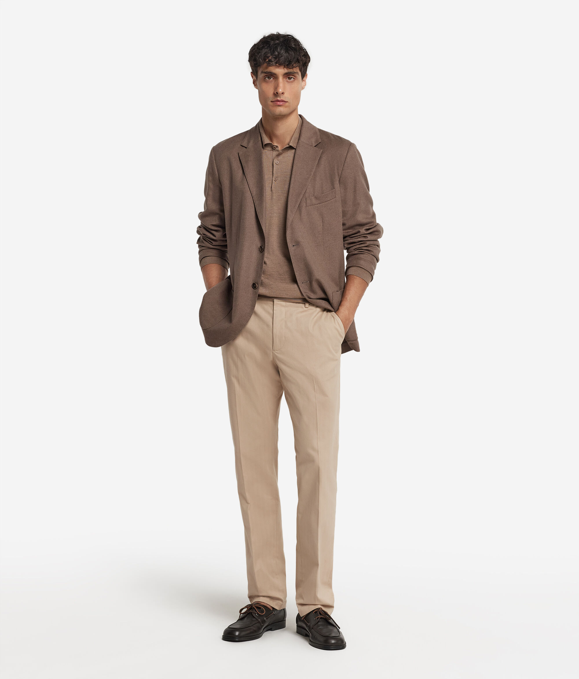 Crafted from a cashmere and cotton herringbone fabric, these chino pants combine softness and textured depth. The design is embellished with tailored details such as slanted pockets on the front and double-welt back pockets with buttons and a waistband with belt loops. The regular fit traces the balanced lines, ensuring comfort and elegance on every occasion, transforming an everyday piece into a sophisticated essential.