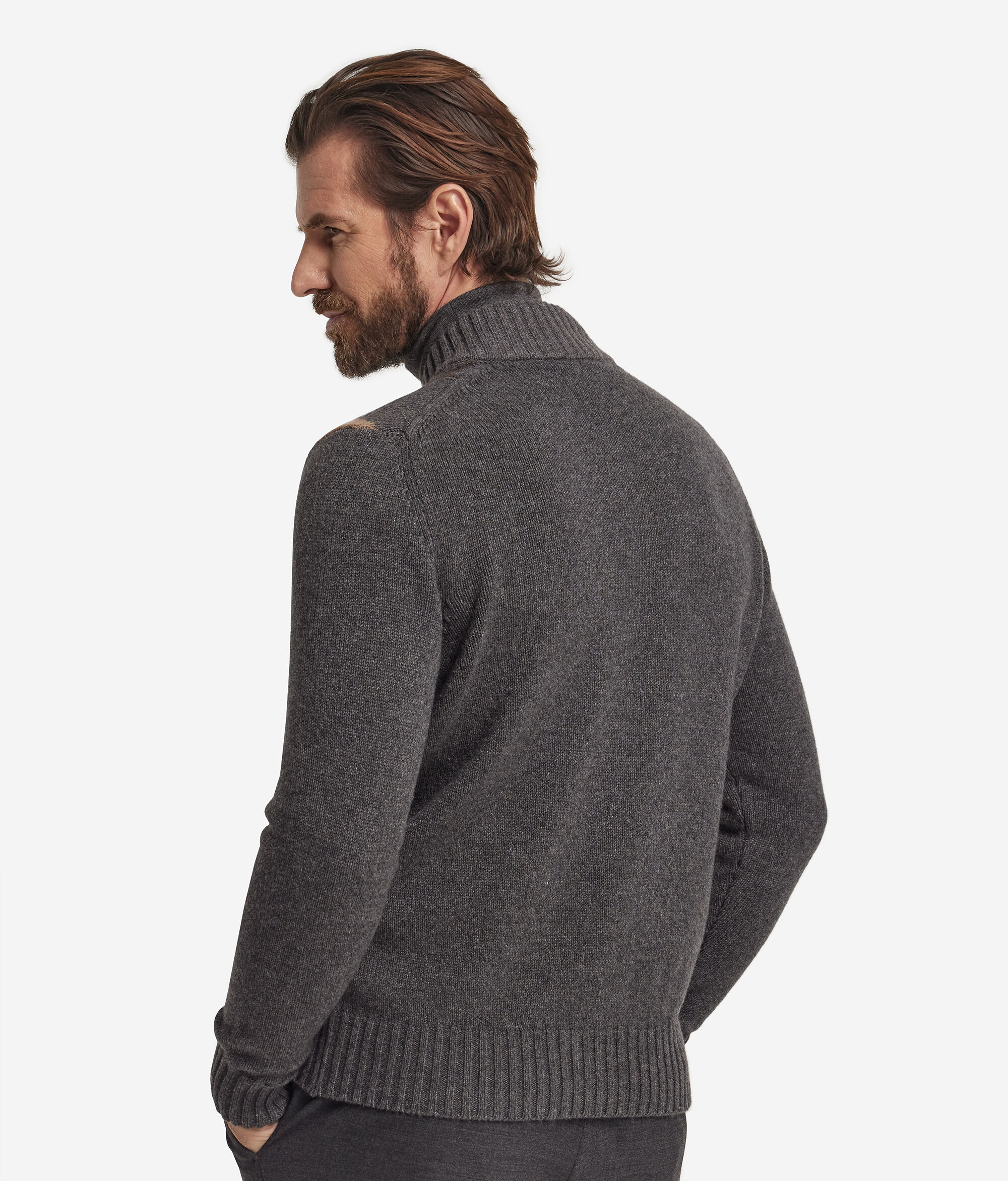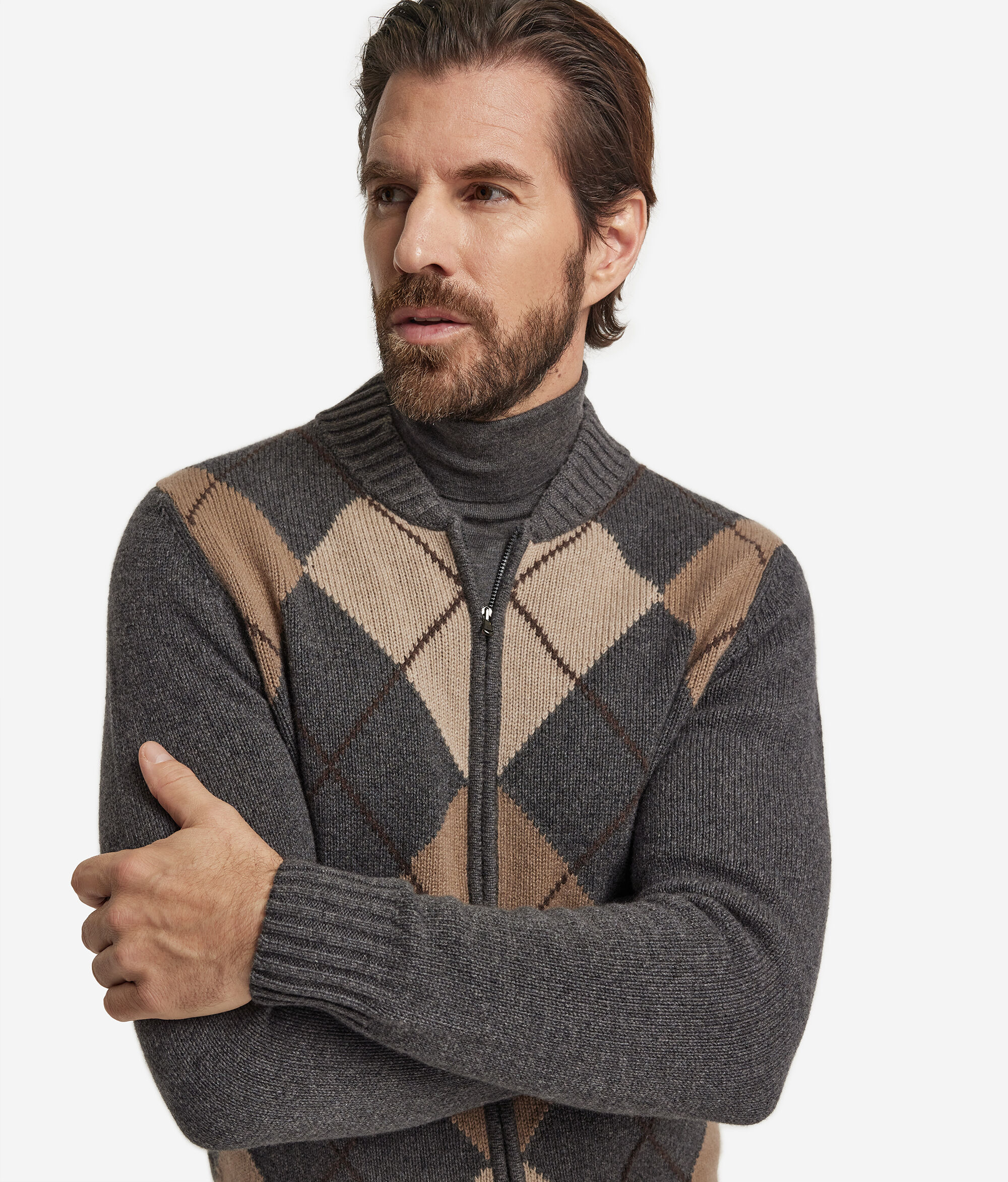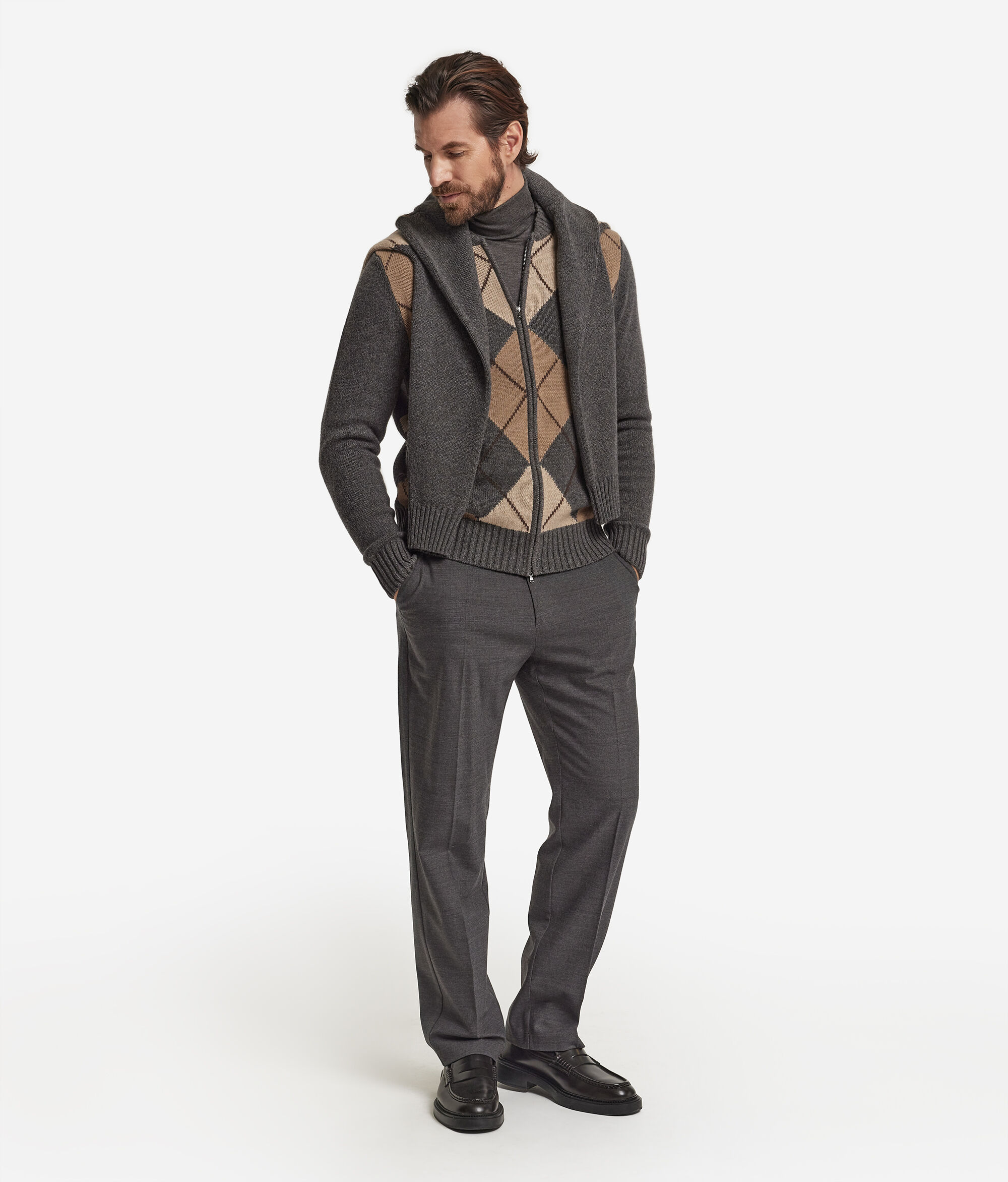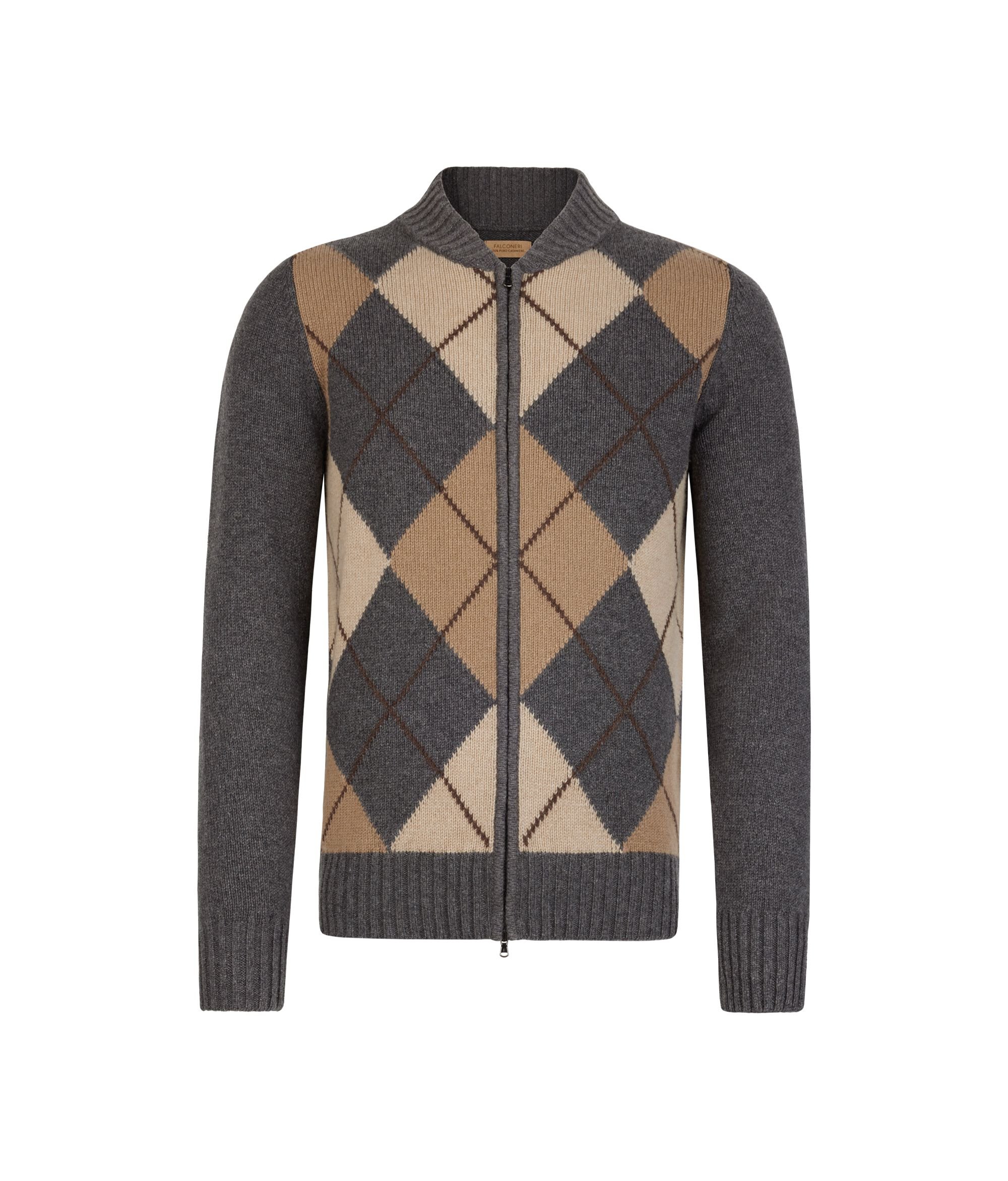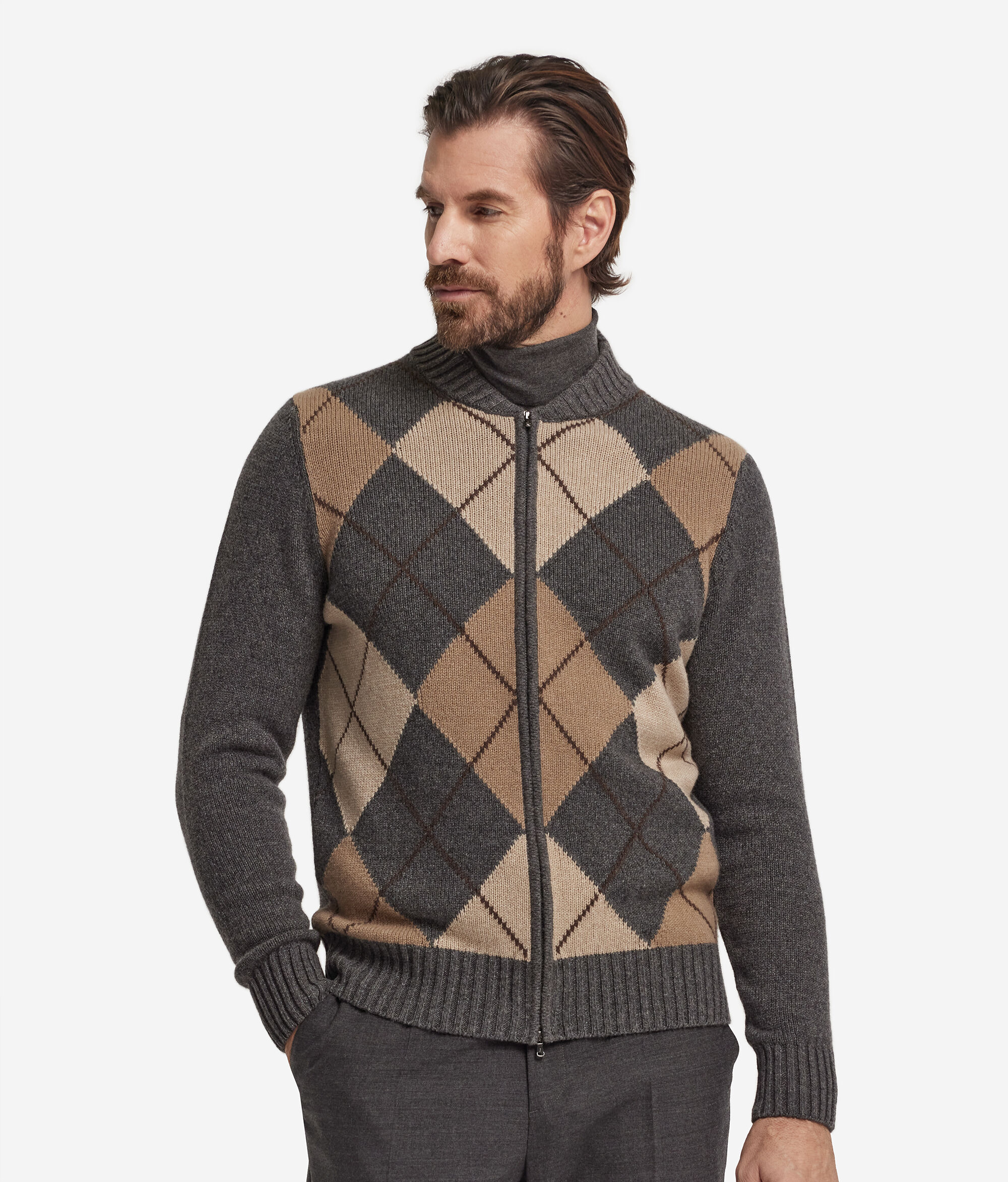 Crafted from Ultrasoft Cashmere, this cardigan envelops you in impalpable softness, enhanced by the diamond-pattern that adds depth and texture. The ribbed collar and English shoulder define the precise lines, while the long sleeves complete the silhouette with natural elegance. The front zipper opening adds practicality and modernity, while the relaxed fit ensures freedom of movement and relaxed style.